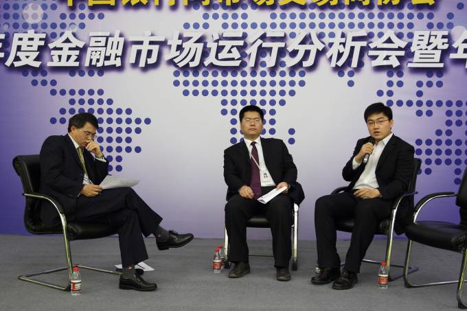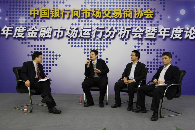 工商银行金融市场部产品研发处处长张兴胜(左一)主持“信用风险与金融衍生产品创新”议题讨论,参与该议题讨论的专家还有环球律师事务所顾问张昕、巴克莱银行全球信用衍生产品部副总裁谈世铭、中信证券债券销售交易部副总裁韩冬。