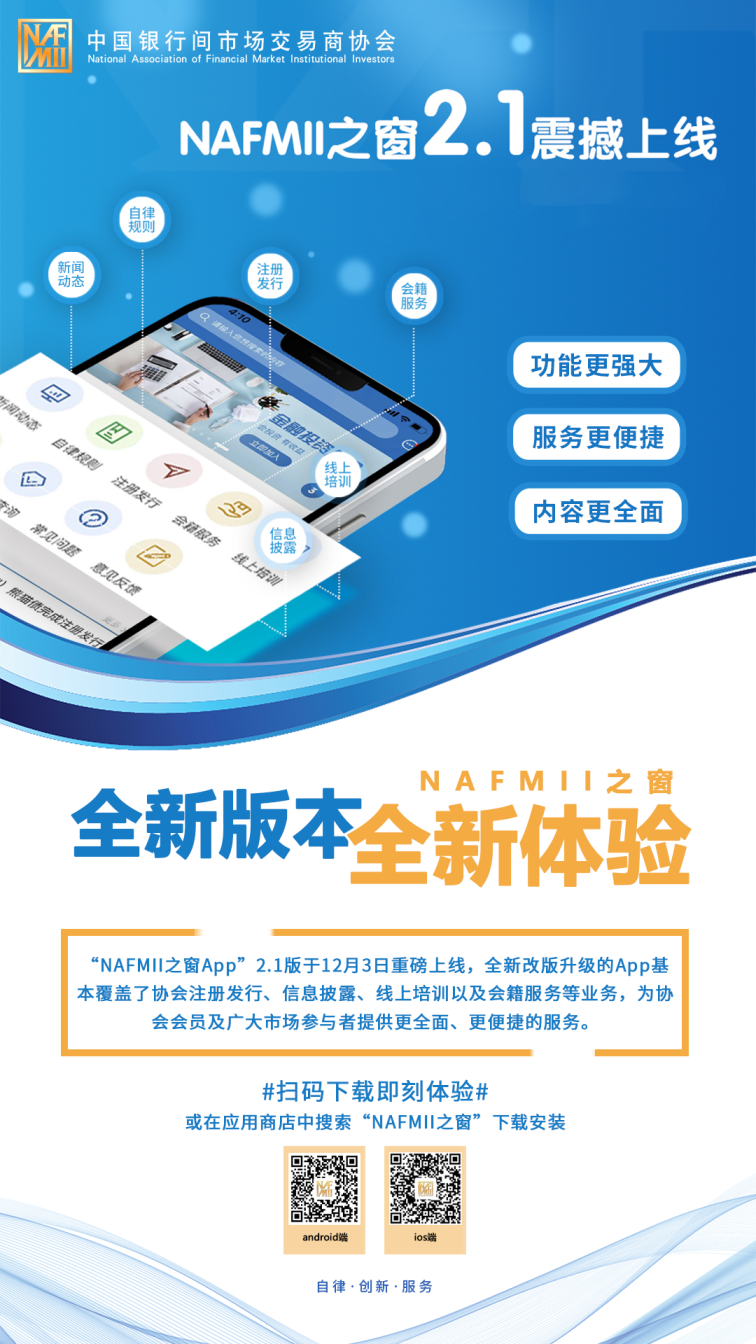 为积极践行“自律、创新、服务”的宗旨,有力提升会员服务水平与效率,交易商协会全新升级的“NAFMII之窗”App2.1版于12月3日上线,实现了对协会注册发行、信息披露、线上培训以及会籍服务等业务的全覆盖,为协会会员及广大市场参与者提供更全面、更便捷的服务。